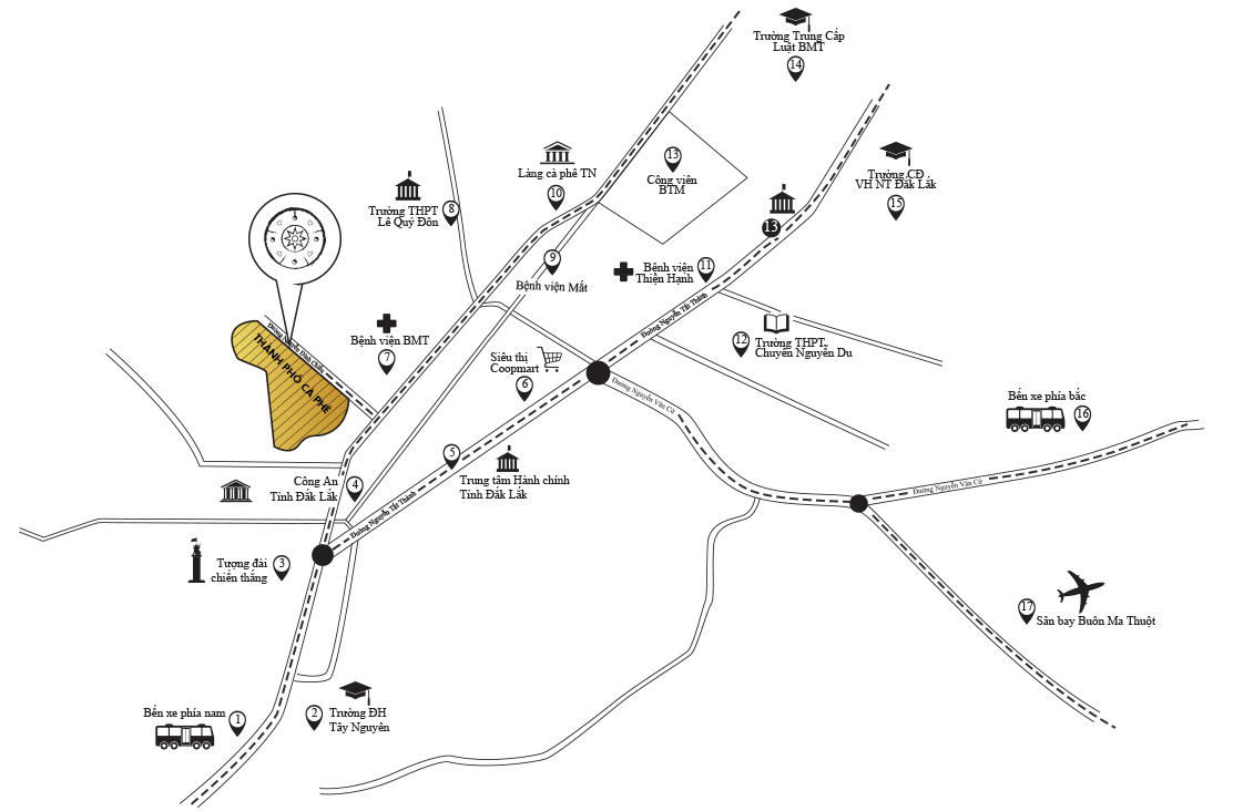 Toạ lạc tại vị trí lõi của thủ phủ nông sản tỷ đô, trong vòng bán kính 2-10.km, từ Thành phố Cà phê có thể dễ dàng kết nối với: sân bay, siêu thị, trung tâm mua sắm, điểm đến du lịch sinh thái chữa lành, trung tâm hành chính, bệnh viện… của Thành phố Buôn Ma Thuột..